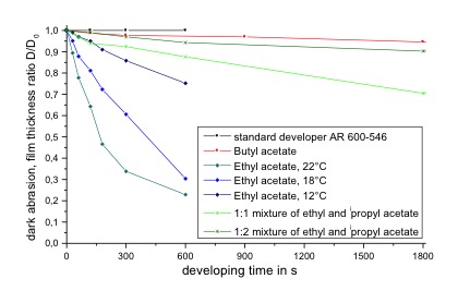The dark erosion of ethyl acetate can furthermore also be reduced to acceptable levels (~ 5-10 % dark erosion for the generally used development times of < 2 minutes by decreasing the developer temperature to 12℃ or 18℃.