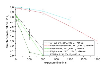 PGMEA and ethyl ethoxypropionate (EEP) result in lower sensitivities, but on the other hand are unexposed resist areas in contrast to AR 600-548 or ethyl acetate only marginally attacked. Extending the development time and/or a development at higher temperatures would most likely result in an increased sensitivity.