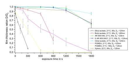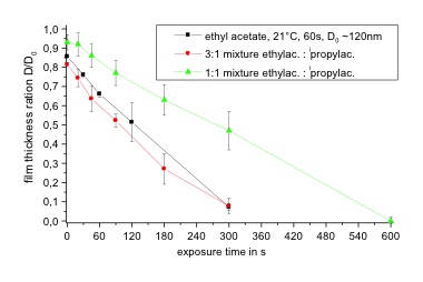 Not surprisingly, the solvents used to obtain the highest possible contrast result in the lowest sensitivity. These weak developers AR 600-546, X AR 600-546/1 and xylene displayed very similar properties. Virtually no dark erosion occurs, and only after a certain threshold dose, the developer shows any effect at all. PGMEA however causes an almost linear development process which is typical of strong developers. Extending the development time from 60 s to 180 s leads here to a significant increase in sensitivity with at the same time low dark erosion of only approx. 12 nm. The highest sensitivity was observed for ethyl acetate (acetic acid). Mixtures with isopropyl cause a considerable decrease of the dark erosion rate, while the sensitivity is at the same time only slightly reduced.