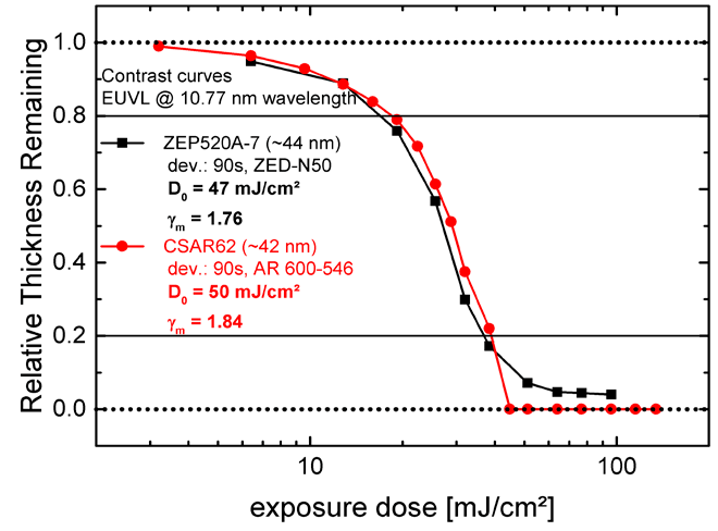 In addition to the use in e-beam lithography, the highly sensitive e-beam resist CSAR 62 can also be structured by exposure to UV radiation since the resist strongly absorbs UV radiation in the wavelength range of 190 – 240 nm. Similar to an irradiation with electrons, polymer bonds are also cleaved by the high-energy UV radiation. The fragmented polymer then shows a significantly increased solubility in the developer in the subsequent development step (positive patterning process). Previously unknown was however the ability to structure CSAR 62 with EUV radiation. Respective studies were conducted at the RWTH Aachen (Chair for Technology of Optical Systems) by Dipl. Ing. S. Brose. Layers of CSAR 62 (AR-P 6200.09) were exposed to EUV radiation (wavelength range of 10 – 16 nm) and compared with respect to contrast and sensitivity to a conventional patterning by electron beam irradiation. For CSAR 62 (layer thickness about 40 nm), a contrast of gamma = 1.8 with a sensitivity of 50 mJ/cm² was determined under EUV irradiation (developer AR 600-546, 5 minutes at room temperature). For e-beam exposure, a sensitivity of 85 µC/cm² was measured, with very similar contrast values. The observed contrast was almost identical for CSAR 62 and ZEP 520A-7, but a higher sensitivity could be measured for CSAR 62.