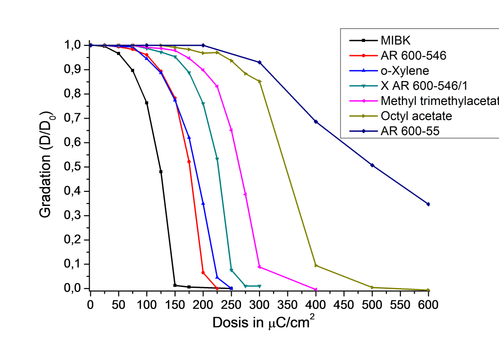 To evaluate the suitability of various developers for CSAR 62, Dr. Lothar Hahn (Karlsruhe Institute of Technology (KIT), Institute of Microstructure Technology) kindly provided various substrates which had previously been exposed to 100 kV e-beam irradiation (dose variations). The substrates were developed for 60 s in different standard developers and other solvents (indicated is in each case only the main solvent as e.g. MIBK, but not minor additions of other solvents), developed, and the development was stopped in IPA. The layer thickness was scanned using a Dektak 150. If the measured layer thickness divided by the respective initial layer thickness (D/D0) is plotted against the radiation dose, characteristic gradation curves for each developer are obtained. The steeper the curve, the higher is the contrast of the developer used. Weaker, high-contrast developer cause no or only low dark erosion (development of unexposed areas). In the case of AR 600-546 (amyl acetate) and X AR 600-546/1 (hexyl acetate), an additional rinsing step for 10 s with pure MIBK was conducted after development prior to the stopping with IPA to ensure a complete, particle-free development.