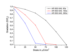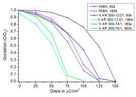 AR 600-548 showed the highest sensitivity of 50 µC/cm2, and the dark erosion can substantially be reduced if shorter development times are chosen. The strong special developer X AR 300-12/21 (containing PGMEA) causes a lower dark erosion as compared to AR 600-548 and is approximately as sensitive as the standard developer AR 600-549 (dose to clear of about 125 µC/cm2). Also the ethylbenzene-based developer X AR 300-74/1 is well suited for a sensitive development of CSAR 62 (dose to clear < 125 µC/cm2). Generally are higher sensitivities observed if the development time is extended to 3 minutes; the dose to clear is significantly reduced.
