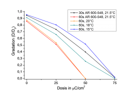 While at room temperature a dark erosion of just below 15 % is observed within 60 s, this rate is reduced to only 5 % if the development step is carried out at 15 °C. At the same time, the dose to clear is reduced from 50 µC/cm2 to approximately 75 µC/cm2, and the contrast increases slightly.