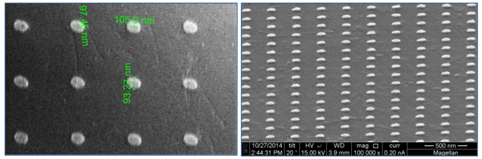 Bjarke Rolighed Jeppesen (Department of Physics and Astronomy, Aarhus University) used a PMMA resist (AR-P 679.03) for the fabrication of plasmonic structures (Ag dots on quartz substrates). These nanostructures may e.g. serve as optical antennas for the detection of single molecules. To avoid the undesirable charges on the quartz substrate, Electra 92 was used successfully. Mr. Jeppesen commented very positively on the simple and reliable handling of the conductive resist and kindly provided the following pictures: