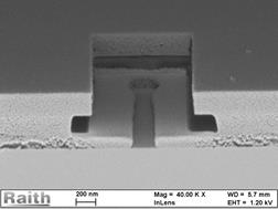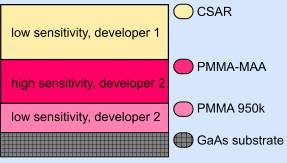 T-gate structures are often required for the fabrication of electronic components (MEMS, HEMTs). Corresponding nanostructures can be realized via e-beam lithography in multi-layer processes. Generally, resist layers with different sensitivities like e.g. PMMAs with varying molecular weight distributions are coated on top of each other, irradiated with electrons and then developed in one step. For the production of more defined architectures it is however advantageous to combine different types of resists. In this case, not only the mixing of the different layers during coating can be avoided, but also the use of selective developers is possible. As a result, high contrasts and accurate undercuts can be achieved.