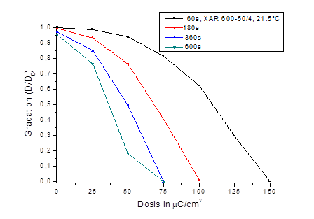 Dose scale for CSAR 62 (AR-P 6200), SB 180°C, layer thickness: ~240nm, 100 kV, developer X AR 600-50/4, gradation curves dependent on development time at 21.5°C, stopper IPA.