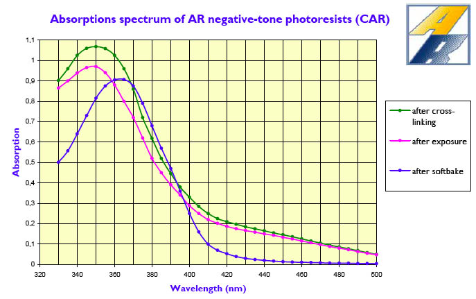 Upon exposure to short-wavelength light and in the presence of traces of water acids are formed, which react with amines under salt formation. The resulting cross-linking proceeds however only slowly at room temperature. A second bake step at approximately 95°C is thus required which accelerates the reaction markedly. The subsequent heating of cross-linked resist layers to temperatures > 150°C leads to a further stabilization and consequently enhanced plasma etch stability. Cross-linking of the so-called CARs (chemically amplified resists) results in altered absorption features (Fig.: 5).