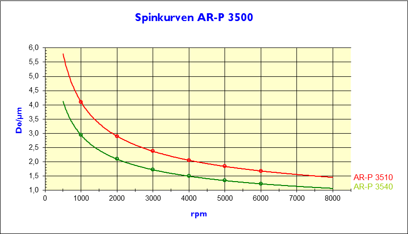 According to a general thumb-rule, resists deposited at 1000 rpm have twice the thickness of a resist deposited at 4000 rpm. This rule allows an estimation of possible film thickness values for a particular resist. For AR-P 3510 , a thickness of 2.0 µm is obtained at 4000 rpm and a thickness of 4.0 µm at 1000 rpm. Accepting a certain formation of rim lips and a lower surface quality, even 8.0 µm thick films can be achieved with a spin speed of 250 rpm, which is however not recommended. Using high spin speeds, a reduction to 1.6 µm (at 6000 rpm) is possible.
