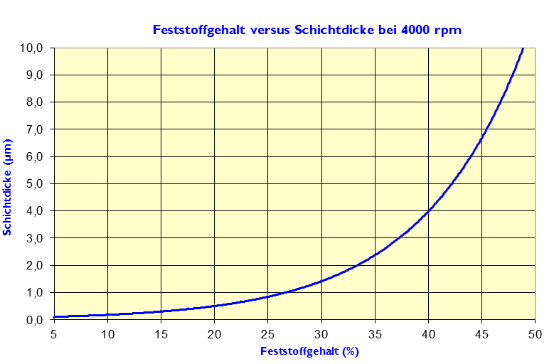 Resists are primarily applied by spin coating. The optimum spin speed ranges from 2000 to 4000 rpm for thin resists and from 250 to 2000 rpm for thicker resist. Spin speed numbers of up to 9000 rpm are generally possible. Under certain circumstances also slower spin speeds of 1000 to 2000 rpm are used to generate thicker films of a particular resist. In these cases however the film quality will suffer and considerable edge beads may be formed (see “Edge beads”). Depending on the respective resist type, film thickness values of 30 nm to 200 µm may be obtained under these circumstances. Thick films of up to 1 mm are produced using casting technologies.