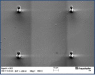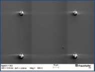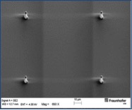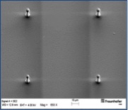 The desired structure size also largely depends on the exposure dose used. In the case of overexposure, structures begin to widen which is particularly pronounced during laser exposure. The image series shows 5 µm-columns obtained with different doses. The determined minimum dose is not high enough for a complete build-up of the 5 µm-column, which results in a pointed cone. With increasing doses (30 mJ/cm² and above), the shape of a column is obtained. At higher values (70 mJ/cm² and more), the diameter of the cylinder increases due to the overexposure and the scattered light associated with it. At 120 mJ/cm², already a diameter of 7.5 µm is reached. Overexposure similarly results in larger structures if mask aligners are used for exposure (photolithography). It is thus strongly recommended to determine the optimum dose at the beginning of the application.