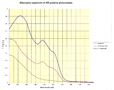 AR photo coatings are sensitive in the broad band UV range (300 – 450 nm) and thus also to the typical emission lines of mercury at 365 nm (i-line), 405 nm (h-line), and 436 nm (g-line) ( Spectrum), with maximum sensitivity in the g-line- and the h-line range. The negative resists AR-N 4300 to 4400 are sensitive in a range between 300 and 436 nm. AR-N 4200 is sensitive between 300 and 380 nm.