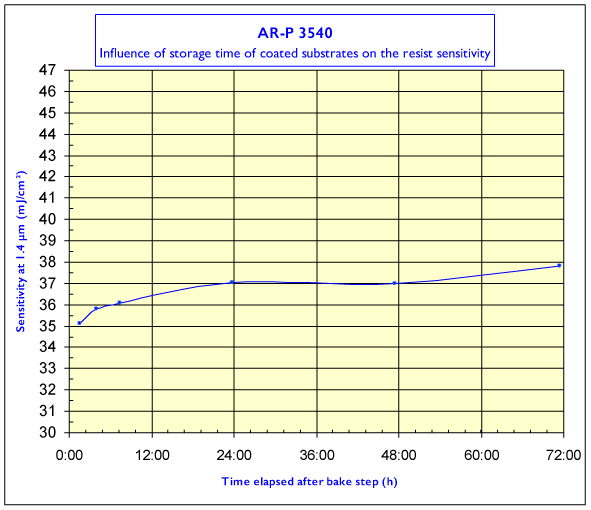 The actual sensitivity as given in our product information depends on at least a dozen parameters. The most important factors are: bake conditions (temperature, time, equipment: hotplate or oven), exposure wavelength, exposure device (filter), layer thickness, developers (strength, time, temperature, type (buffered or not)), time after bake and after exposure, rehydration time after the bake, service life of the developer bath. But every user employs different procedures and thus has to determine the optimum exposure dose in own tests. For positive resists, the exposure dose (dose to clear) which is required to develop a large area without structures in a suitable development time (depending on the film thickness, for 1 – 2 µm approximately 30 – 40 s) should be increased by 10 – 20 % for structural imaging. For negative resists, the time for a complete development of unexposed areas of 1 – 2 µm is also about 30 – 40 s. The exposure dose which produces a film of > 90 % of Do should similarly be increased by 10 – 20 % for patterning.