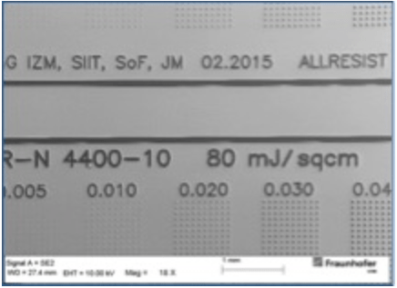 The sensitivity of the resist is exceptionally good. A dose of only 7 mJ/cm² is sufficient to realise a complete layer build-up. Other negative resists are exclusively designed for i-line (365 nm) exposure. Negative resist AR-N 4400-10 thus is in addition a good choice for various applications with 405 nm lasers. Even during g-line exposure (436 nm), the resist is still sufficiently sensitive. Especially notable is e.g. the structuring of irregularly shaped substrates which are coated by dip coating with the special resist AR-N 4340-10 S6 (a modification of AR-N 4400-10). In this case, exposure is not performed through masks, but using a laser.