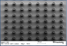 Negative resist AR-N 4400-10 can be structured with laser direct exposure at an exposure wavelength of 405 nm. Different arrays are shown in the figure. The column diameter varies from 5 µm to 50 µm; the exposure dose was in a range between 7 mJ/cm² and 200 mJ/cm². In this test series, the film thickness was about 11 µm.