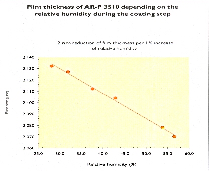 Generally used coating conditions are temperatures of 20 to 25 °C with a temperature constancy of + 1 °C (optimum 21 °C) and a relative humidity of 30 to 50 % (optimum 43 %). Above a humidity of 70 %, coating is basically impossible. The air moisture also affects the film thickness which is reduced with increasing humidity. For AR-P 3510, the film thickness decreases by about 2 nm per each percent of humidity. At spin speeds of > 1500 rpm, 30 s are sufficient to obtain the desired film thickness. At lower spin speeds, the time should be extended to 60 s. For an exposure of rectangular masks, usually a Gyrset (closed chuck) system is used which provides a higher film quality and reduces edge bead formation. It has however to be taken into account that the film thickness decreases to approximately 70 % of the film thickness which is obtained with open chucks.