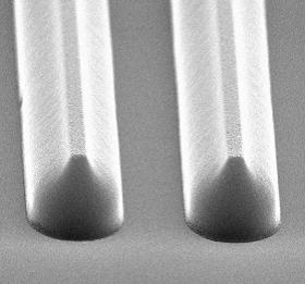 The general aim of electron beam lithography is to achieve a maximum resolution, and therefore mostly very thin layers are used (50 – 500 nm). In a few cases however also very small structures with high aspect ratio are of interest. Examples for possible applications are electroforming processes or the generation of a nano-library for the storage of smallest substance samples. For this purpose, 4 μm-thick layers of the e-beam resist SX AR-N 7700.38 were exposed, tempered and developed (AR 300-47).