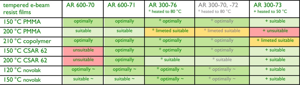 For e-beam resist films (except novolac-based layers) that were tempered up to 200 °C, we generally recommend remover AR 600-71 which works already at room temperature highly efficiently. This product is especially intended for customers who are able to use removers with low flash point.
