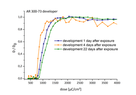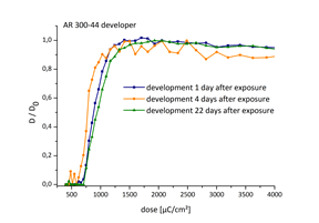Also developers with higher TMAH concentration can be used for Medusa 82, e.g. AR 300-73. With comparably good contrast, the sensitivity is slightly lower as compared to a development with AR 300-44 (0.26 n TMAH). The stored samples again show a nearly identical behaviour.
