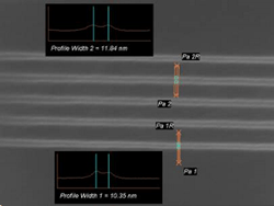 For this purpose, aptitude tests were carried out at Raith GmbH. The area dose was approx. 1250 μC/cm² (30 kV); the resolution of single lines about 11 nm (Fig. 1). Development was performed in aqueous-alkaline manner in a strong TMAH solution. Even higher resolutions are possible if specially adapted developers are used.