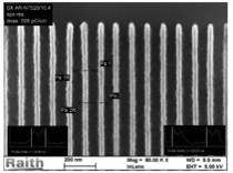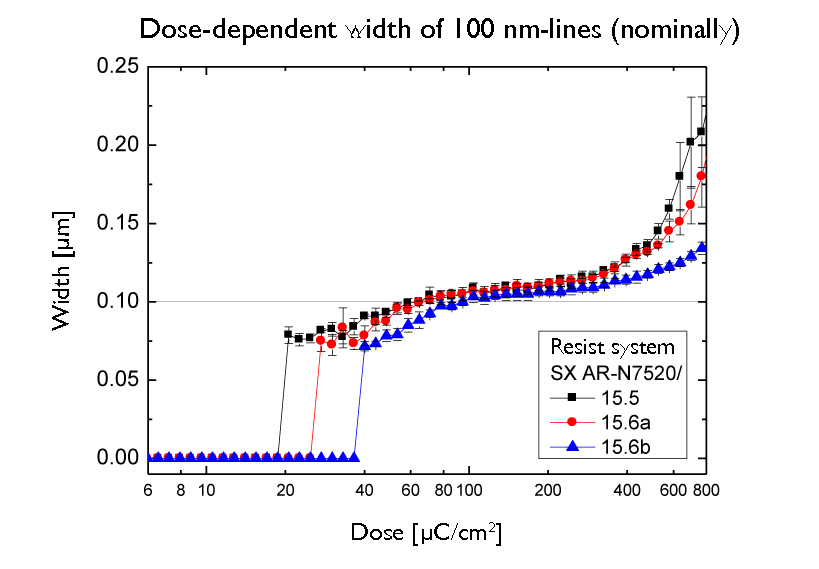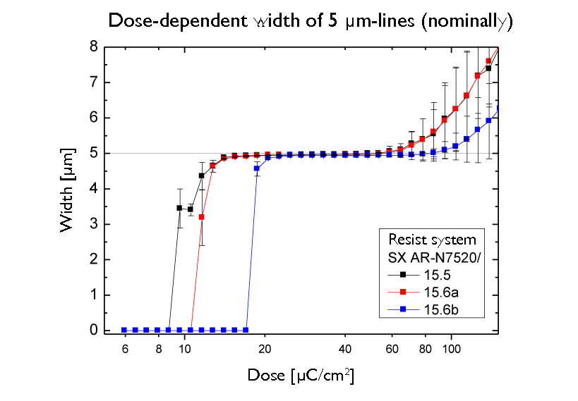 Smaller structures require higher exposure doses. This also becomes evident in the case of SX AR-N 7530/1. The dependency of the dose on the structural width is depicted in the following figure 1. At a structural width of 5 µm, only a dose of approx. 13 µC/cm² (30 kV) is required. The dose required for 100 nm-lines however is in a range of 35 – 40 µC/cm². Quite similar results were obtained for AR-N 7520 new.