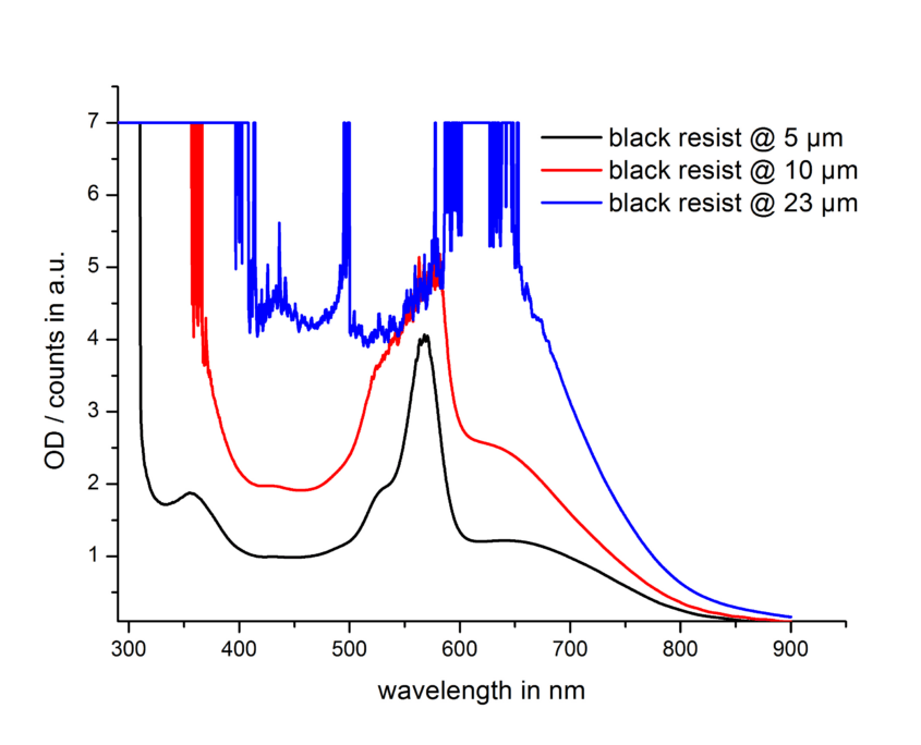 For a surprisingly high number of applications, it is important to disable the transparency of the substrates completely, while still having the option to generate structures. The optically protected area should possibly cover the whole UV/VIS range from 200 – 1.000 nm. For the area of 200 -350 nm this is quite simple, since the resist components already absorb sufficiently there. For wave lengths > 350 nm, colorants must be added, which generate the desired absorption for longer waves.
