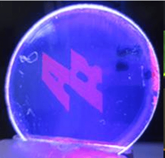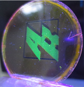It is even possible to manufacture two-coloured fluorescent architectures with these resists. For this purpose, glass plates were firstly treated with AR 300-80 (new) and then coated with different fluorescent Atlas 46 S variants (1000 rpm, 90 s, SB 65 °C for 10 minutes). Subsequently, exposure was carried out (flood exposure, 4 minutes) using different masks (“AR logo small” as positive and as negative mask). After a PEB for 3 minutes between 105 °C and 110 °C, development was performed in PMA (time for complete development was about 10 – 15 s, but layers are still stable after 30 – 60 s) and blown dry. The successfully realised and fully developed structures were subsequently coated with a second resist (750 rpm, 2 minutes, SB 10 min at 65 °C). The second colour was chosen according to the greatest possible colour contrast (e.g. the combination blue-yellow or red-yellow). Both resists do not mix since already established structures are highly stable. The second exposure (as well as the PEB; analogous to the first step) allowed the structuring of the upper layer (for the AR logo, inverse masks were used). After development with PMA, the differently fluorescent areas on the substrate become visible in black light: