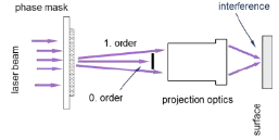 The laser beam can also be used for the generation of 3d structures. Interference projection through a phase mask allows the generation of grid structures with sinusoidal course and very little surface roughness.