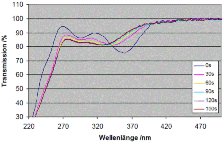 Fig. 1: Transmission spectrum; influence of increasing exposure time on the transmission (Hg vapor lamp)
