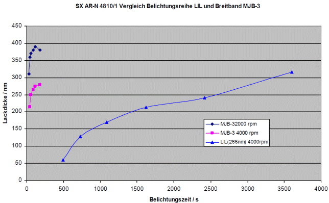 With the new experimental sample SX AR-N 4810/1, resist thicknesses of up to about one micrometer are possible: ~ 650 nm (1000 rpm), ~ 480 nm (2000 rpm) and ~ 320 nm (4000 rpm). The developer consists of an ethylbenzene solvent mixture: X AR 300-74/1.