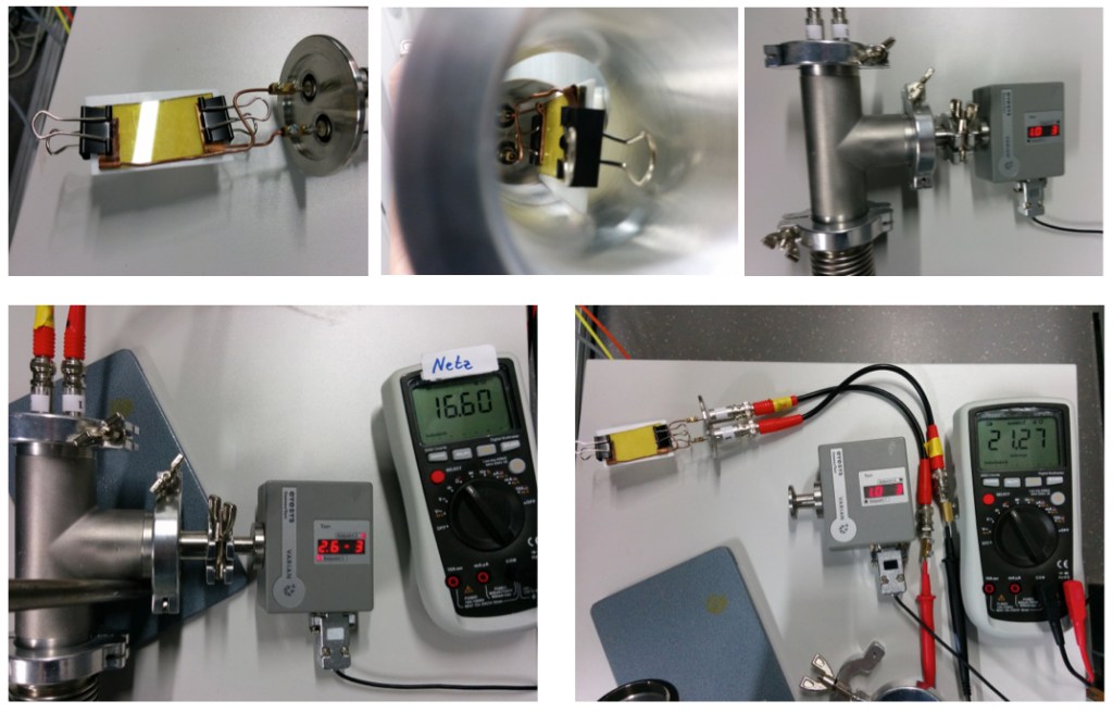 Under atmospheric conditions, a resistance of > 21 MΩ was measured. The resistance decreased rapidly to 16.6 MΩ directly after applying the vacuum (2*10-3 Torr) and finally decreased further to about 12.7 MΩ (at 2*10-4 Torr). After ventilation, the measured resistance quickly increased again to 20 MΩ.