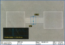 An accurate patterning on quartz substrates is not possible without the use of a conductive coating. Investigations of the company Raith GmbH demonstrated that an HSQ resist XR1541 on a quartz substrate can be patterned with very high quality after coating with Electra 92. According to Raith GmbH has this so far not been achieved with any other conductive coatings. Resist XR1541 (20 nm thick) was irradiated with the required dose of 4300 µC/cm² (area dose). AR-PC 5090.2 (former SX AR-PC 5000/90.2) was then completely removed within 2 minutes with warm water, and no residues could be observed. After development of the HSQ resist, the desired structures with 20 nm-bars remained (see Fig.).