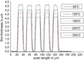 Many applications demand coatings with excellent thermal stability. Structures of the temperature-stable negative resist SX AR-N 4340/6 are able to withstand temperatures of up to 350 °C with high shape accuracy (Fig. 1); merely shrinkage of up to 20% is observed (Fig. 2).