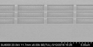 After coating and soft bake, the upper resist layer (PPA) is scanned with a hot needle (NanoFrazor). With each needle tip, the thermolabile PPA evaporates and thus transfers the desired structures into the layer. During the following lift-off process, the lower layer is at first dissolved isotropically with a solvent mixture, thereby generating the undercut. The duration of the development step and the developer temperature both influence the degree of the undercut decisively. The undercut can thus be easily controlled by these means. First trials with this system were conducted by SwissLitho. Fig. 2 shows the undercut of bottom resist AR-P 617, Fig. 3 the coating structures (top PPA, below the developed AR-P617).