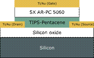 Fig. 1: Schematic structure of an organic field effect transistor (OFET) with SX AR-PC 5060