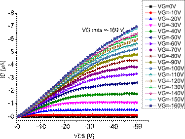 Fig. 2: Characteristic curves of an OFET, top-gate based on TIPS-pentacene with SX AR PC 5060 as insulating layer; stable up to VGS = -160 V.