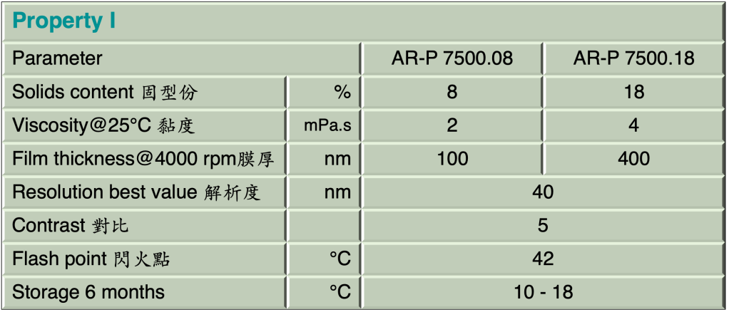 AR-N 7500系列, 為負型電子束微影阻劑 (negative tone EBL resist). 可在電子束及紫外光波長曝光(deep UV, I line, G line), 適合於半導體混搭製程(mix & match). 產品系列目前有: