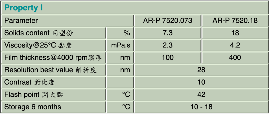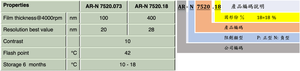 與新品(AR-N 7520 new)比較, AR-N 7520系列需要較高的曝光能量,優點是可獲得較為垂直圖案. 產品系列目前有: