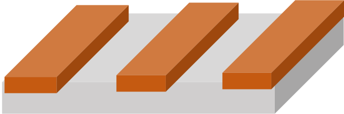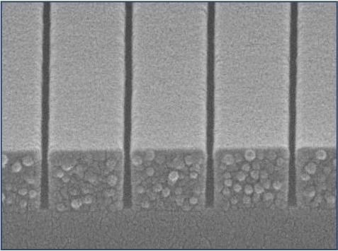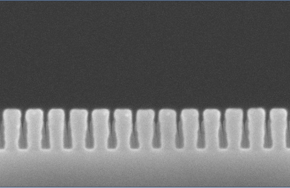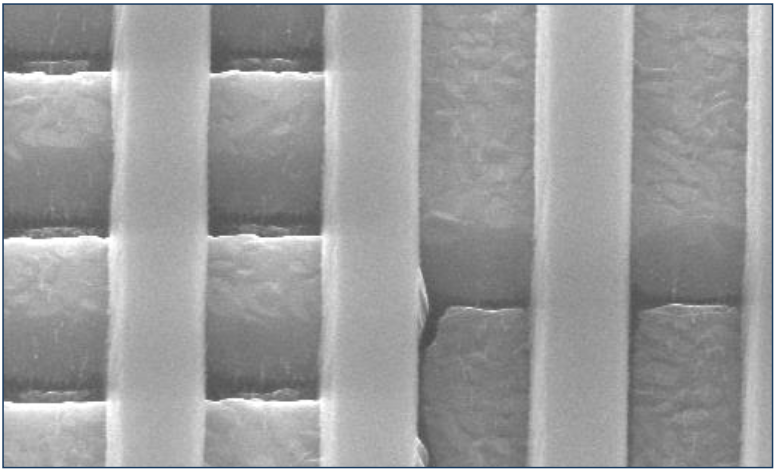 Due to the excellent coating properties is it possible to level out topologies which are present on the wafer before development. In this example, 200 nm high oxide structures were coated with AR-P 617.08. The film thickness was 780 nm. After exposure (20 kV) and development (AR 600-50, 2 min), the structured wafer is covered with entirely planar resist lines.