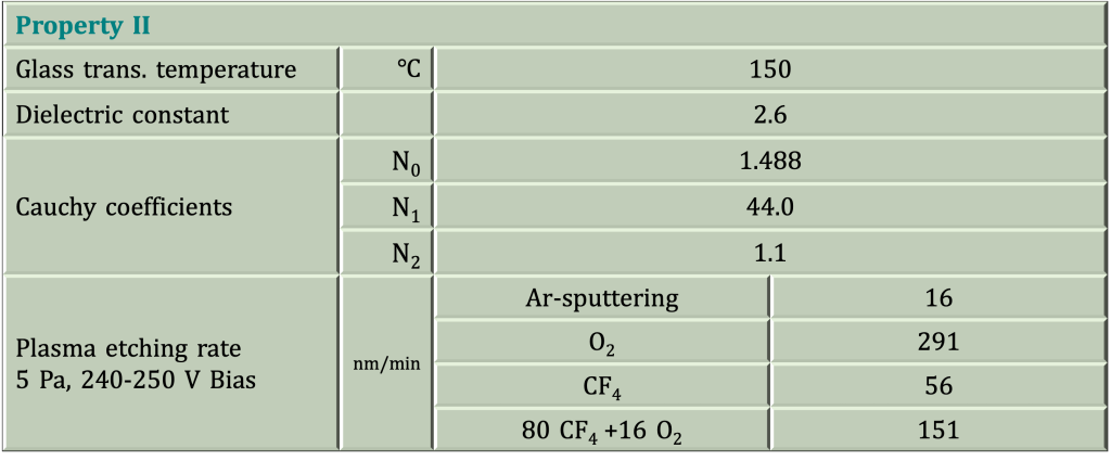 由於共聚物及組合成份的化學特性,其敏感性(sensitivity)是PMMA阻劑的3-4倍. 同時其對比性(contrast)也優於PMMA阻劑. 顯影後的阻劑結構在240°C能有良好的安定性.(thermal-stability).
