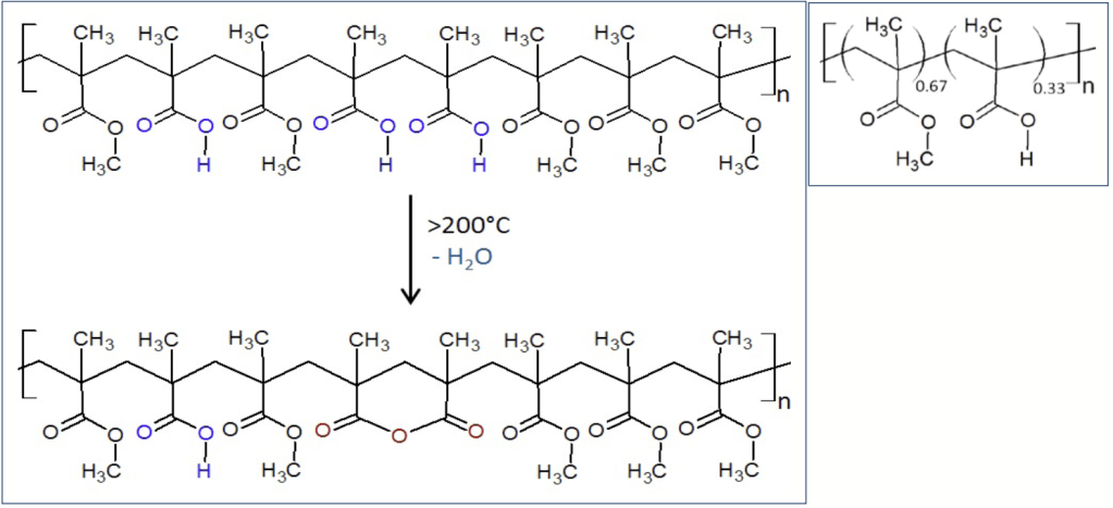 The copolymer composed of methyl methacrylate and methacrylic acid is, in contrast to pure PMMA products, able to form a 6-ring during thermal loading. In this case, 2 methacrylic acid groups have to be arranged adjacent to each other in the polymer chain (see large structural formula left), which statistically occurs with sufficiently high frequency at a mixing ratio of 2 : 1 (see molecular formula top right). The reaction is possible at this temperature, since the water which is produced during the reaction is a very good leaving group.The 6-ring which is formed breaks apart more easily during irradiation with electrons than the aliphatic chain remainder which causes the higher sensitivity of the copolymer. Once adjusted, the sensitivity will remain unchanged. The reverse ring-opening reaction is impossible.