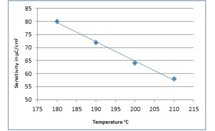 With increasing temperature, the sensitivity of AR-P 617.08 (film thickness 680 nm) increases linearly.