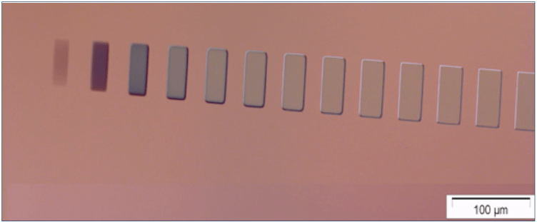 The sensitivity changes in dependence on the acceleration voltage. While 1300 μC/cm2 is sufficient at 30 kV, this value increases to 4000 μC/cm2 at 100 kV. Figure 1 shows the corresponding dose scale (90 s AR 300-44, 23 °C). Recommended are development times of 60-90 s.