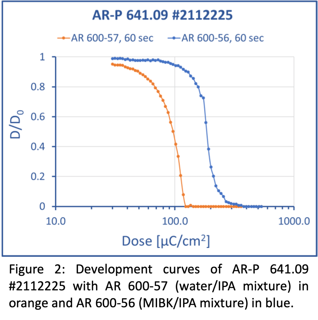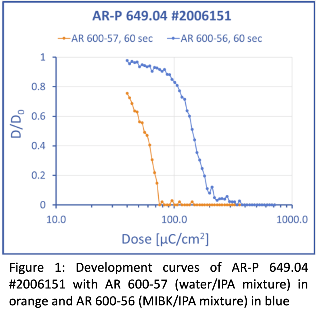| AR 600-57 is a mixture of isopropanol and water – this may sound surprising at first, IPA is known as a developer for PMMA, however, usually a high exposure dose is required. Mixing with water that by itself does not develop PMMA at all, results in a new developer with high process speed close to that or even faster than MIBK/IPA mixtures. In further investigations, it was found, as shown in Table 1, that AR 600-57 increases the sensitivity of PMMA resists while maintaining contrast. The investigations could also already be reproduced. The developer is currently attracting a great deal of interest from our cooperation partners, so that further (positive) results are in prospect. AR 600-57是IPA與水的混合物 – IPA一般用於PMMA時需較高的曝光劑量, 純水更是不可能顯開PMMA阻劑. 令人訝異的是,兩者混合,顯影速度比傳統MIBK/IPA混合物還快一些. 更多的研究如表(1)顯示, 以AR 600-57顯影會提高PMMA阻劑的敏感度同時維持相當的對比度. 研究也顯示結果的重現性. 很多合作夥伴對AR 600-57有興趣,預期有更多的正面結果. | ||||