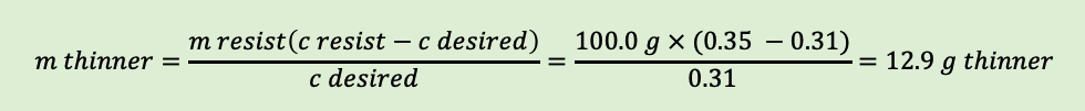 Example: Starting with a resist with 35 % solids content (AR-P 3510), a solids content of 31 % is desired. Requested is the amount of thinner AR 300-12 in g which has to be added to 100 g resist with 35 % solids content (mass m in g, solids content c /100).