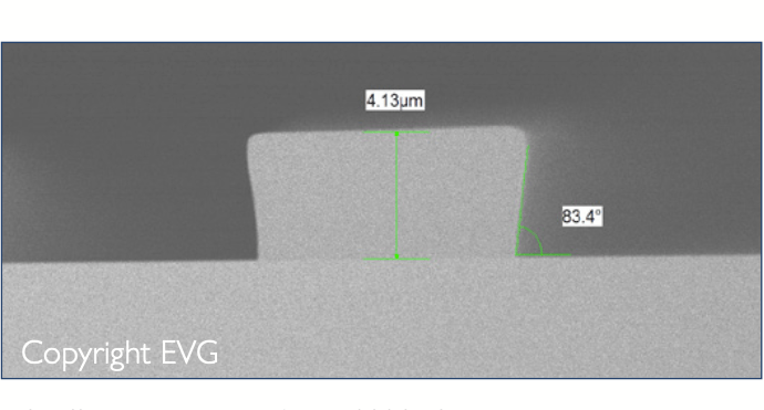 For an exposure of positive resists, the entire UV-range of 300 to 450 nm can be utilized, while for the exposure of negative resists, a range between 300 to 436 nm is recommended. The exposure time generally depends on the film thickness. For a film thickness of about 5 μm, the sensitivity of positive resists is approx. 200 mJ/cm2. Negative-tone resists with approx. 70 mJ/cm2 are substantially more sensitive and require shorter exposure times, which is advantageous for the exposure of wafers with extreme topologies in order to prevent un- desirable reflexions.