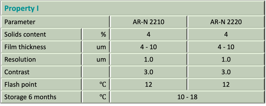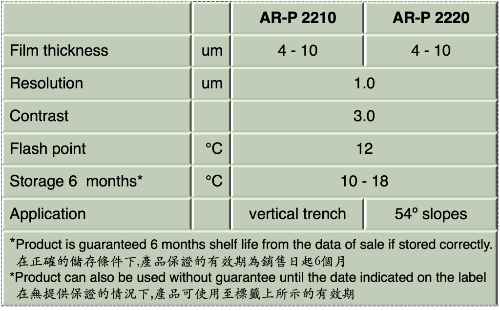 AR-P 1230及AR-N 2230需要較低的曝光劑量. 負型光阻需要曝後烤以完成高分子架橋.