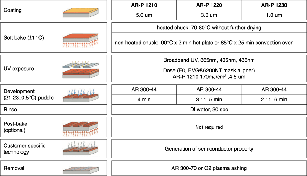 AR-P 1230及AR-N 2230需要較低的曝光劑量. 負型光阻需要曝後烤以完成高分子架橋.