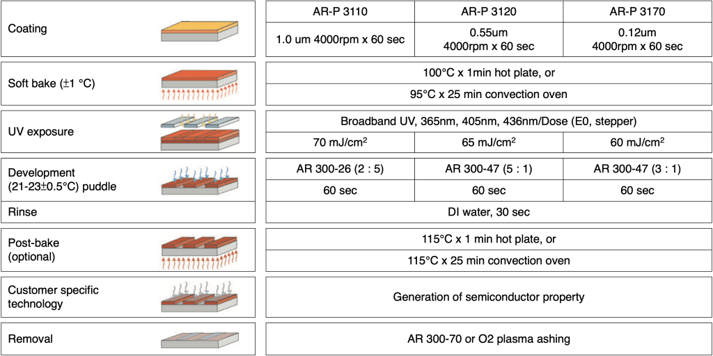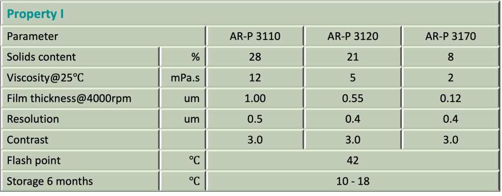 AR-P 3100 系列,產品配方強化與基板介面的接著度,適合各類精密微影製程的正型阻劑。