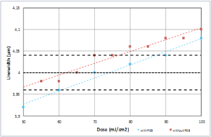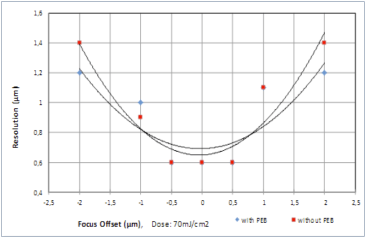 Without PEB, a higher resolution is obtained since the focus curve is steeper (PEB, 90 °C, 60 s).