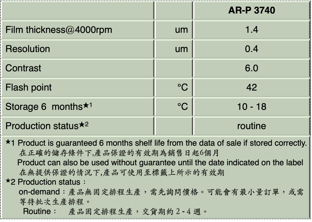AR-P 3500 產品為高敏感度正型i-line光阻,適合次微米高密度積體電路製程。